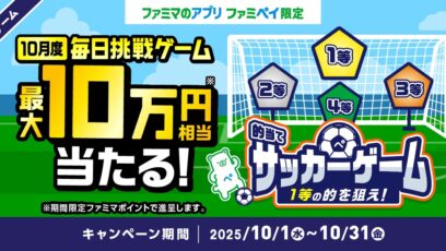 ネット応募の懸賞【毎日・アプリ】ファミマポイント最大10万円相当が9,610,033名様にその場で当たる! 締切:2025-10-31 ファミマのアプリ ファミペイ限定 10月度 毎日挑戦ゲーム 賞品: 1等:10万円相当ファミマポイント(3名様) 2等:1万円相当ファミマポイント(30名様) 3等:10...ネット応募の懸賞大量当選(1000名~)の懸賞豪華賞品が当たる懸賞ギフト券・商品券が当たる懸賞毎日応募できる懸賞