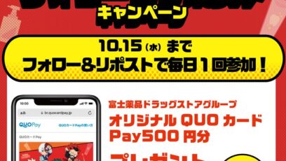 SNS応募の懸賞【毎日・X懸賞】オリジナルQUOカードPay500円分が100名様にその場で当たる! 締切:2025-10-15 セイムス‐僕のヒーローアカデミア フォロー&リポストキャンペーン 賞品:「セイムス×僕のヒーローアカデミア」デザイン 富士薬品ドラッグストアグループオリジナルQUOカードPay...SNS応募の懸賞大量当選(100名~)の懸賞ギフト券・商品券が当たる懸賞毎日応募できる懸賞