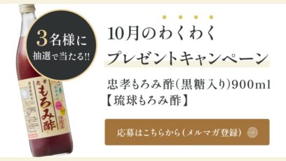 ネット応募の懸賞忠孝もろみ酢(黒糖入り)900mlを3名様にプレゼント 締切:2025-10-31 忠孝酒造 わくわくプレゼントキャンペーン 賞品:忠孝もろみ酢(黒糖入り)900ml(3名様) 締切:2025年10月31日(金) メルマガ購読期間中はずっとプレゼント...ネット応募の懸賞