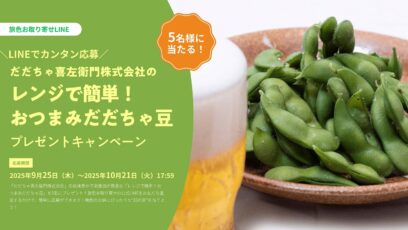 SNS応募の懸賞【LINE懸賞】レンジで簡単!おつまみだだちゃ豆を5名様にプレゼント 締切:2025-10-21 旅色お取り寄せグルメ‐だだちゃ喜左衛門株式会社の「レンジで簡単!おつまみだだちゃ豆」プレゼントキャンペーン 賞品:レンジで簡単!おつまみだだちゃ豆(5名様) 締切:2025...SNS応募の懸賞