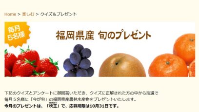 ネット応募の懸賞福岡県産「秋王」を5名様にプレゼント 締切:2025-10-31 ファームステーション‐クイズ&プレゼント 賞品:秋王(5名様) 締切:2025年10月31日(金) クイズとアンケートに御回答いただき、クイズに正解された方の中から抽...ネット応募の懸賞