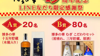 SNS応募の懸賞【LINE懸賞】博多の華 十五年貯蔵 木箱入り、博多の華 むぎ こだわりセットを合計100名様にプレゼント 締切:2026-01-13 オエノングループ‐博多の華 45周年記念キャンペーン 賞品: 博多の華 十五年貯蔵(木箱入り)1本 20名様 博多の華 むぎ こだわりセット 80名様 締切:2026年...SNS応募の懸賞大量当選(100名~)の懸賞
