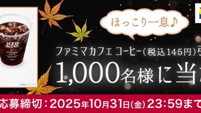 ネット応募の懸賞ファミマカフェのコーヒー無料引換券を1,000名様にプレゼント 締切:2025-10-31 Vサンプル‐ほっこり一息♪秋のファミマカフェのコーヒープレゼントキャンペーン 賞品:ファミマカフェのコーヒー引換券(1,000名様) 締切:2025年10月31日(金) ...ネット応募の懸賞大量当選(1000名~)の懸賞