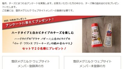 ネット応募の懸賞ハードタイプと白カビタイプのチーズを楽しむセットを20名様にプレゼント 締切:2025-10-31 雪印メグミルク チーズクラブ‐プレゼントキャンペーン 賞品:ハードタイプと白カビタイプのチーズを楽しむセット(20名様) 締切:2025年10月31日(金) ご応募に...ネット応募の懸賞