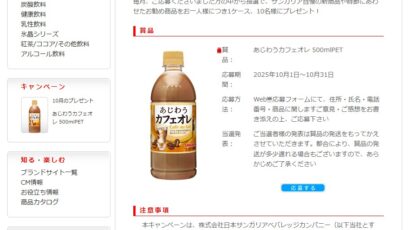 ネット応募の懸賞あじわうカフェオレ 500ml 1ケースを10名様にプレゼント 締切:2025-10-31 サンガリア 今月のプレゼント 賞品:あじわうカフェオレ 500ml 1ケース(10名様) 締切:2025年10月31日(金) 商品に対するご意見・ご感想をお聞かせくだ...ネット応募の懸賞