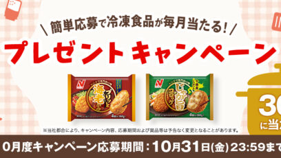 ネット応募の懸賞ニチレイの冷凍食品詰め合わせセットを30名様にプレゼント 締切:2025-10-31 ニチレイフーズ‐プレゼントキャンペーン 賞品:ニチレイの冷凍食品詰め合わせセット(30名様) 締切:2025年10月31日(金) クイズに答えてご応募ください。 ...ネット応募の懸賞