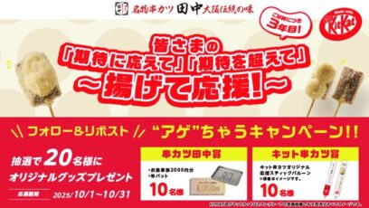 SNS応募の懸賞【X懸賞】ソース缶・ソースボトル・串カツ田中お食事券&串カツバット、キット串カツオリジナル応援スティックバルーンを合計20名様にプレゼント 締切:2025-10-31 串カツ田中‐フォロー&リポスト”アゲ”ちゃうキャンペーン 賞品: ソース缶・ソースボトル・串カツ田中お食事券2,000円分&串カツバット(10名様) キット串カツオリジナル...SNS応募の懸賞