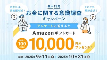 ネット応募の懸賞Amazonギフトカード1万円分を100名様にプレゼント 締切:2025-10-17 ウェルスナビ‐お金に関する意識調査キャンペーン 賞品:Amazonギフトカード1万円分(100名様) 締切:2025年10月31日(金) ご応募には会員登録/ログイン...ネット応募の懸賞大量当選(100名~)の懸賞ギフト券・商品券が当たる懸賞