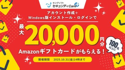 ネット応募の懸賞Amazonギフト券最大20,000円分を合計105名様にプレゼント 締切:2025-10-31 キングソフトセキュリティCare+ Amazonギフトカードがあたるキャンペーン 賞品: Amazonギフトカード(デジタルタイプ)20,000円分・・・1名様 Amazo...ネット応募の懸賞大量当選(100名~)の懸賞ギフト券・商品券が当たる懸賞