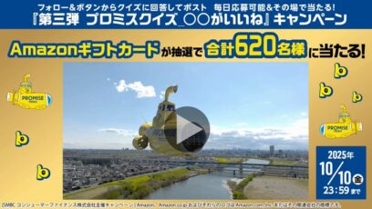 SNS応募の懸賞【毎日・X懸賞】Amazonギフト券最大5,000円分が合計620名様にその場で当たる! 締切:2025-10-10 プロミス‐『第三弾プロミスクイズ_○○がいいね!』キャンペーン 賞品: Amazonギフトカード5,000円分(20名様) Amazonギフトカード1,000円分(200名...SNS応募の懸賞大量当選(100名~)の懸賞ギフト券・商品券が当たる懸賞毎日応募できる懸賞