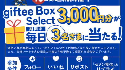 SNS応募の懸賞【毎日・X懸賞】giftee Box Select 3,000円分を毎日3名様にプレゼント 締切:2025-10-13 セゾン投信のプレゼント企画 賞品:giftee Box Select 3,000円分(毎日3名様) 締切:2025年10月13日(月) ① @saisonam をフォ...SNS応募の懸賞ギフト券・商品券が当たる懸賞毎日応募できる懸賞