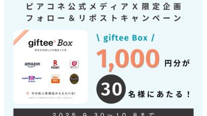 SNS応募の懸賞【X懸賞】giftee Box 1,000円分を30名様にプレゼント 締切:2025-10-08 ピアコネ‐フォロー&リポストキャンペーン 賞品:giftee Box 1,000円分(30名様) 締切:2025年10月8日(水) 公式X(Twitter)アカウント...SNS応募の懸賞ギフト券・商品券が当たる懸賞