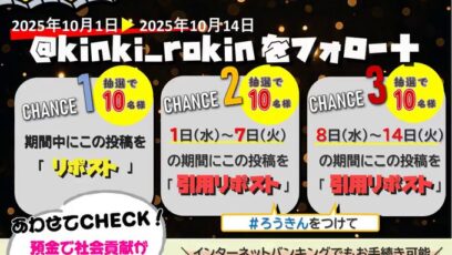 SNS応募の懸賞【X懸賞】えらべるPay2,000円分を10名様にプレゼント 締切:2025-10-08 近畿ろうきん‐プレゼントキャンペーン 賞品:えらべるPay2000円分(10名様) 締切:2025年10月8日(水) 応募方法: アカウントをフォロー #ろうきん...SNS応募の懸賞ギフト券・商品券が当たる懸賞