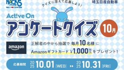 ネット応募の懸賞Amazonギフト券1,000円分を10名様にプレゼント 締切:2025-10-31 Active On アンケートクイズ 賞品:Amazonギフト券1,000円分(10名様) 締切:2025年10月31日(金) 「埼玉日産アンケートクイズ」に答えてA...ネット応募の懸賞ギフト券・商品券が当たる懸賞