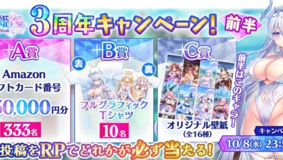 SNS応募の懸賞【毎日・X懸賞】Amazonギフト券最大30,000円分、フルグラフィックTシャツが343名様にその場で当たる! 締切:2025-10-08 宝石姫 Reincarnation‐3周年記念キャンペーン 賞品: Amazonギフト券最大30,000円分(333名様) フルグラフィックTシャツ(10名様) 締切:...SNS応募の懸賞大量当選(100名~)の懸賞ギフト券・商品券が当たる懸賞毎日応募できる懸賞