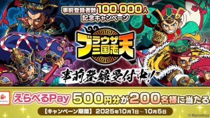SNS応募の懸賞【毎日・X懸賞】えらべるPay500円分が200名様にその場で当たる! 締切:2025-10-05 ブラウザ三国志 天(ブラ天)‐事前登録者数100,000人記念キャンペーン 賞品:えらべるPay 500円分(200名様) 締切:2025年10月5日(日) ブラウザ...SNS応募の懸賞大量当選(100名~)の懸賞ギフト券・商品券が当たる懸賞毎日応募できる懸賞
