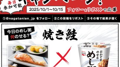 SNS応募の懸賞【毎日・X懸賞】Amazonギフト券500円分が1,000名様にその場で当たる! 締切:2025-10-15 永谷園‐平日毎日参加できる!めし粥発売記念 賞品:Amazonギフト券500円分(1,000名様) 締切:2025年10月15日(水) 永谷園公式X(Twitter)...SNS応募の懸賞大量当選(1000名~)の懸賞ギフト券・商品券が当たる懸賞毎日応募できる懸賞