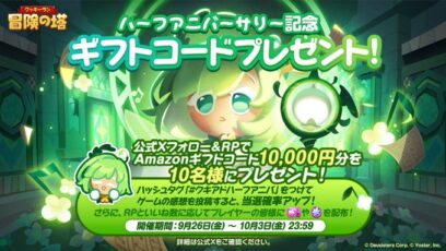 SNS応募の懸賞【X懸賞】Amazonギフトコード10,000円分を10名様にプレゼント 締切:2025-10-03 クッキーラン:冒険の塔‐#ハーフアニバーサリー 記念 賞品:Amazonギフトコード10,000円分(10名様) 締切:2025年10月3日(金) 公式X(Twitt...SNS応募の懸賞ギフト券・商品券が当たる懸賞