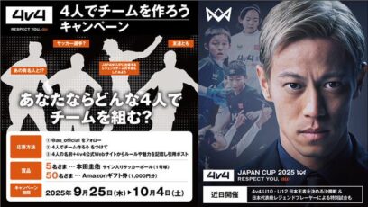 SNS応募の懸賞【X懸賞】本田圭佑サイン入りサッカーボール、Amazonギフト券1,000円分を合計55名様にプレゼント 締切:2025-10-04 au‐本田圭佑考案⚽4v44人でチームを作ろう!キャンペーン 賞品: 本田圭佑サイン入りサッカーボール(5名様) Amazonギフト券1,000円分(50名様...SNS応募の懸賞ギフト券・商品券が当たる懸賞