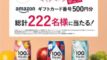 SNS応募の懸賞【毎日・X懸賞】Amazonギフト券500円分を222名様にプレゼント 締切:2025-10-15 100%カジューハイ‐100%カジューハイ2周年の実りキャンペーン第2弾 賞品:Amazonギフト券500円分(222名様) 締切:2025年10月15日(水) 10...SNS応募の懸賞大量当選(100名~)の懸賞ギフト券・商品券が当たる懸賞毎日応募できる懸賞