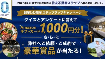 ネット応募の懸賞Amazonギフト券1,000円分を毎月500名様にプレゼント 締切:2025-10-31 住友不動産ステップ創業50周年ステップアップキャンペーン 賞品:Amazonギフト券1,000円分(毎月500名様) 締切:2025年10月31日(金) クイズとアン...ネット応募の懸賞大量当選(100名~)の懸賞ギフト券・商品券が当たる懸賞