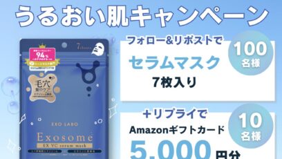 SNS応募の懸賞【毎日・X懸賞】セラムマスク、Amazonギフト券5,000円分を合計110名様にプレゼント 締切:2025-10-03 チョコザップ / chocoZAP‐#チョコザップとEXOLABOでうるおい肌 賞品: セラムマスク(100名様) Amazonギフト券5,000円分(10名様) 締切...SNS応募の懸賞大量当選(100名~)の懸賞ギフト券・商品券が当たる懸賞毎日応募できる懸賞
