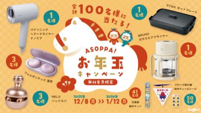 ネット応募の懸賞パナソニック ヘアードライヤー ナノケア、STAN.ホットプレート、BRUNO エアフライヤー、RELX ヘッドスパなどを合計100名様にプレゼント 締切:2026-01-12 ASOPPA! 2026年 お年玉キャンペーン 賞品: パナソニック ヘアードライヤー ナノケア ミストグレー STAN.ホットプレート EA-FA10 BA BRUNO...ネット応募の懸賞大量当選(100名~)の懸賞豪華賞品が当たる懸賞