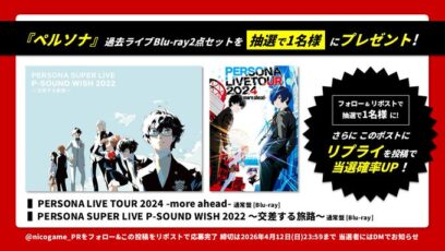 SNS応募の懸賞【X懸賞】『ペルソナ』ライブBlu-ray(2024&2022)を1名様にプレゼント 締切:2026-04-12 ニコニコゲーム‐フォロー&リポストキャンペーン 賞品:『ペルソナ』ライブBlu-ray(2024&2022)2点セット(1名様) 締切:2026年4月12日(日) 公...SNS応募の懸賞