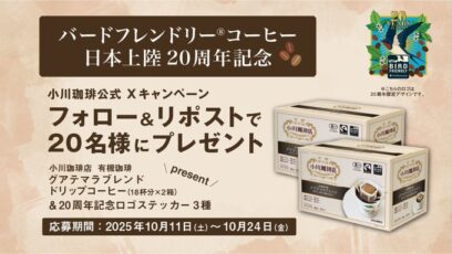SNS応募の懸賞【X懸賞】小川珈琲店 有機珈琲 グアテマラブレンド ドリップコーヒー 2箱&20周年記念ロゴステッカー3種を20名様にプレゼント 締切:2025-10-24 小川珈琲‐フォロー&リポストキャンペーン 賞品:「小川珈琲店 有機珈琲 グアテマラブレンド ドリップコーヒー 18杯入り」×2箱&「20周年記念ロゴステッカー3種」(20名様)...SNS応募の懸賞