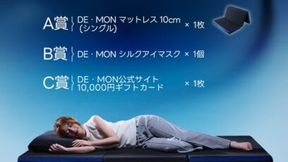 DE・MON‐新生活応援キャンペーン 賞品: ・A賞:DE・MONマットレス 厚さ10cm(シングルサイズ)×1名様 ・B賞:DE・MONシルクアイマスク×3名様 ・C賞...
