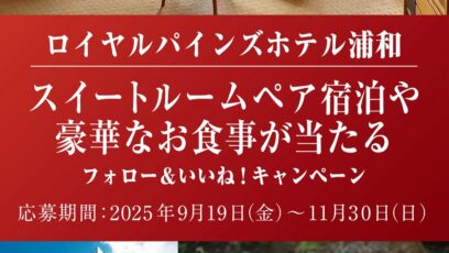 SNS応募の懸賞【Instagram懸賞】ロイヤルパインズホテル浦和 ラグジュアリースイートルームペア宿泊ご招待、日本料理「四季彩」ペアお食事ご招待を2組様にプレゼント 締切:2025-11-30 ロイヤルパインズホテル浦和‐フォロー&いいねキャンペーン 賞品: ・ロイヤルパインズホテル浦和 ラグジュアリースイートルームペア宿泊ご招待:1組2名様 ・日本料理「四季...SNS応募の懸賞