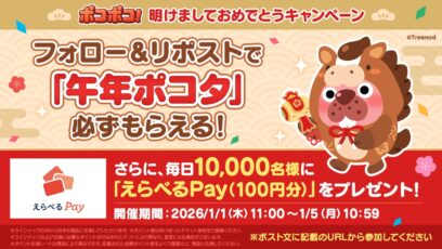 LINE ポコポコ‐明けましておめでとうキャンペーン 賞品:えらべるPay100円分(毎日10,000名様) 締切:2026年1月5日(月)10:59 LINE ポコ...