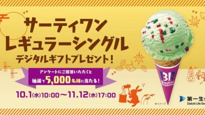 SNS応募の懸賞【LINE懸賞】サーティワン レギュラーシングルデジタルギフトを5,000名様にプレゼント 締切:2025-11-12 第一生命 LINE公式アカウント 友だち限定キャンペーン 賞品:サーティワン レギュラーシングルデジタルギフト(5,000名様) 締切:2025年11月12日(水)17:0...SNS応募の懸賞大量当選(1000名~)の懸賞