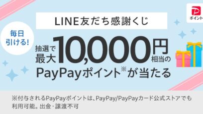 SNS応募の懸賞【毎日・LINE懸賞】PayPayポイント最大10,000円相当が総計150,330名様にその場で当たる! 締切:2025-12-31 Yahoo!ショッピング‐LINE友だち感謝くじ 賞品: 1等:PayPayポイント10,000円相当 30本 2等:PayPayポイント500円相当 300本 3等:P...SNS応募の懸賞大量当選(1000名~)の懸賞ギフト券・商品券が当たる懸賞毎日応募できる懸賞