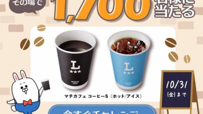 SNS応募の懸賞【LINE懸賞】ローソン「マチカフェ コーヒーS」無料引き換えクーポンが1,700名様にその場で当たる! 締切:2025-10-31 長谷工グループ‐友だち限定 10月のプレゼントキャンペーン 賞品:ローソン「マチカフェ コーヒーS(ホット/アイス)」無料クーポン(1,700名様) 締切:2025年10月...SNS応募の懸賞大量当選(1000名~)の懸賞