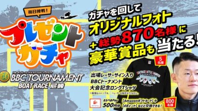 ボートレースプレゼントガチャ 賞品: ・出場レーサーサイン入りBBCトーナメント大会記念ロングTシャツ ・ボートレース目覚まし大時計 ・プレゼントガチャロゴ入り ポケット...