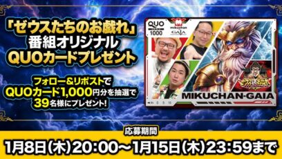 でちゃう!動画告知‐#ゼウスたちのお戯れ フォロー&リポストキャンペーン 賞品:QUOカード1,000円分(39名様) 締切:2026年1月15日(木) 公式X(Tw...