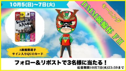 SNS応募の懸賞【X懸賞】A級優勝選手サイン入り小田原競輪QUOカードを3名様にプレゼント 締切:2025-10-07 小田原けいりん‐モーニング・DMM競輪杯 FⅡXキャンペーン 賞品:A級優勝選手サイン入り小田原競輪QUOカード(3名様) 締切:2025年10月7日(火) 公式X(...SNS応募の懸賞ギフト券・商品券が当たる懸賞