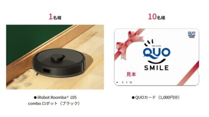 ネット応募の懸賞アイロボット Roomba 105 Combo ロボット、QUOカード1,000円分を合計11名様にプレゼント 締切:2025-10-13 My House Palette‐夜家事に関するアンケート 賞品:アイロボット Roomba 105 Combo ロボット、QUOカード1,000円分(11名様) 締切:2...ネット応募の懸賞豪華賞品が当たる懸賞ギフト券・商品券が当たる懸賞