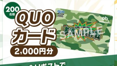 SNS応募の懸賞【毎日・X懸賞】オリジナルQUOカード2,000円分が200名様にその場で当たる! 締切:2025-10-16 anime blast‐本渡楓と天津飯大郎の「本渡上陸作戦」初上陸記念キャンペーン 賞品:オリジナルQUOカード2,000円分(200名様) 締切:2025年10月16日(...SNS応募の懸賞大量当選(100名~)の懸賞ギフト券・商品券が当たる懸賞毎日応募できる懸賞