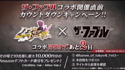 SNS応募の懸賞【毎日・X懸賞】Amazonギフト券最大10,000円分が10名様にその場で当たる! ハーレムオブトーキョー×ザ・ファブルコラボ開催記念カウントダウンCP 賞品:Amazonギフト券最大10,000円分(10名様) 締切:不明 公式X(Twitter)...SNS応募の懸賞ギフト券・商品券が当たる懸賞毎日応募できる懸賞