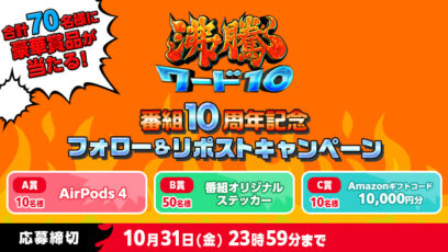 SNS応募の懸賞【X懸賞】AirPods 4、番組オリジナルステッカー、Amazonギフト券10,000円分を合計70名様にプレゼント 締切:2025-10-31 沸騰ワード10 番組10周年記念 賞品: A賞:AirPods 4 10名様 B賞:番組オリジナルステッカー 50名様 C賞:Amazonギフトコード 10,000円分 ...SNS応募の懸賞ギフト券・商品券が当たる懸賞