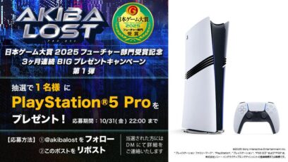 SNS応募の懸賞【X懸賞】PlayStation 5 Proを1名様にプレゼント 締切:2025-10-31 『AKIBA LOST』日本ゲーム大賞フューチャー部門受賞記念 賞品:PlayStation 5 Pro(1名様) 締切:2025年10月31日(金)22時 公式X(...SNS応募の懸賞豪華賞品が当たる懸賞
