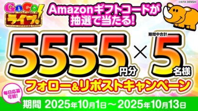 SNS応募の懸賞【毎日・X懸賞】Amazonギフト券5,555円分を5名様にプレゼント 締切:2025-10-13 GOGO!ライブ‐フォロー&リポストキャンペーン 賞品:Amazonギフト券5,555円分(5名様) 締切:2025年10月13日(月) GOGO!ライブ公式X(Tw...SNS応募の懸賞ギフト券・商品券が当たる懸賞毎日応募できる懸賞