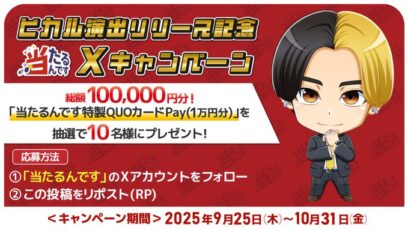 SNS応募の懸賞【X懸賞】特製QUOカードPay1万円分を10名様にプレゼント 締切:2025-10-31 当たるんです‐総額10万円!#ヒカル 演出リリース記念 賞品:当たるんです 特製QUOカードPay 1万円分(10名様) 締切:2025年10月31日(金) 公式X(...SNS応募の懸賞ギフト券・商品券が当たる懸賞
