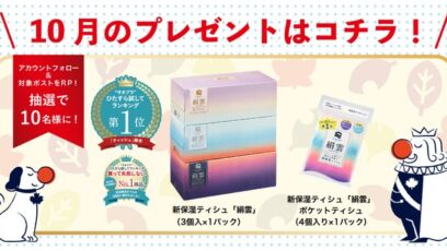 SNS応募の懸賞【X懸賞】「新保湿ティッシュ 絹雲」のBOX&ポケットティッシュを10名様にプレゼント 締切:2025-10-31 河野製紙株式会社(Kawanoファミリー)‐フォロー&リポストキャンペーン 賞品:「新保湿ティッシュ 絹雲」のBOX&ポケットティッシュ(10名様) 締切:2025年10月...SNS応募の懸賞