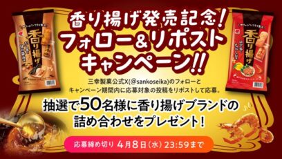 三幸製菓‐新商品「#香り揚げ」の発売記念 賞品:香り揚げブランドの詰め合わせ(50名様) 締切:2026年4月8日(水) 公式X(Twitter)アカウントをフォロー...