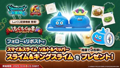SNS応募の懸賞【X懸賞】スマイルスライム ソルト&ペッパー スライム&キングスライムを5名様にプレゼント 締切:2025-10-08 ドラゴンクエストウォーク‐フォロー&リポストキャンペーン 賞品:スマイルスライム ソルト&ペッパー スライム&キングスライム(5名様) 締切:2025年10月8日(水) ...SNS応募の懸賞
