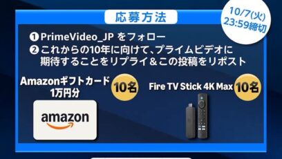 SNS応募の懸賞【X懸賞】Amazonギフトカード1万円分、Fire TV Stick 4K Maxを合計20名様にプレゼント 締切:2025-10-07 プライムビデオ10周年記念プレゼントキャンペーン 賞品: Amazonギフトカード1万円分(10名様) Fire TV Stick 4K Max(10名様) 締切:20...SNS応募の懸賞ギフト券・商品券が当たる懸賞