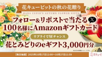 花キューピットの秋の花贈りキャンペーン 賞品: Amazonギフトカード500円分(100名様) 花とみどりのeギフト3,000円分(10名様) 締切:2025年10月...